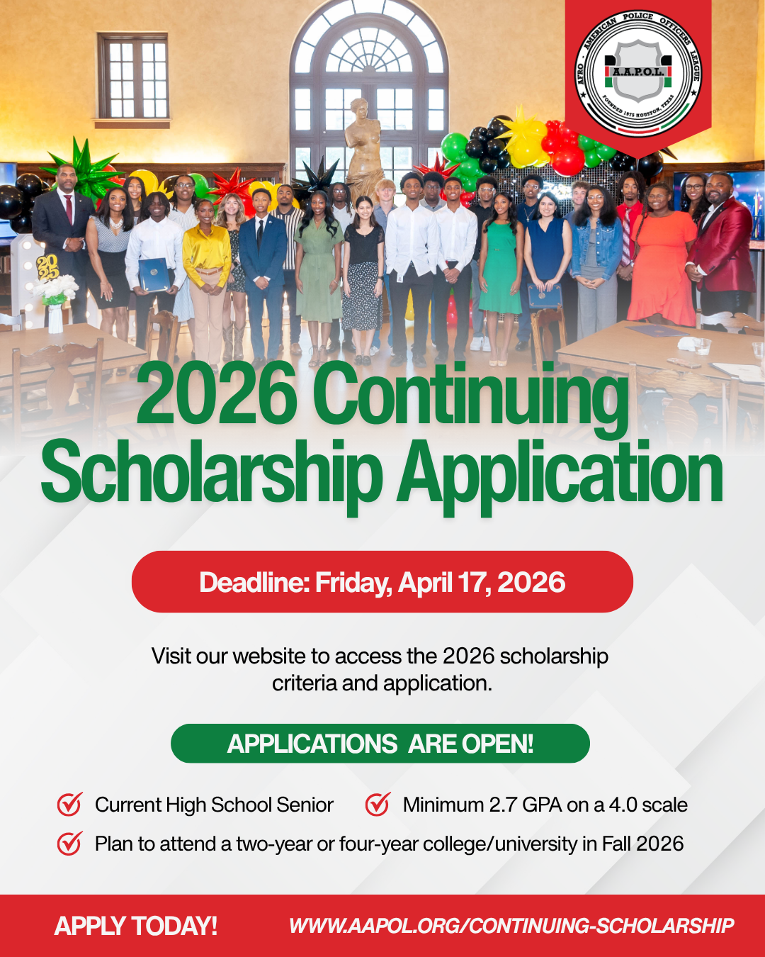2026 AAPOL scholarship application packets must be complete and submitted by Friday, April 17, 2026 at 5:00PM to be considered for review.