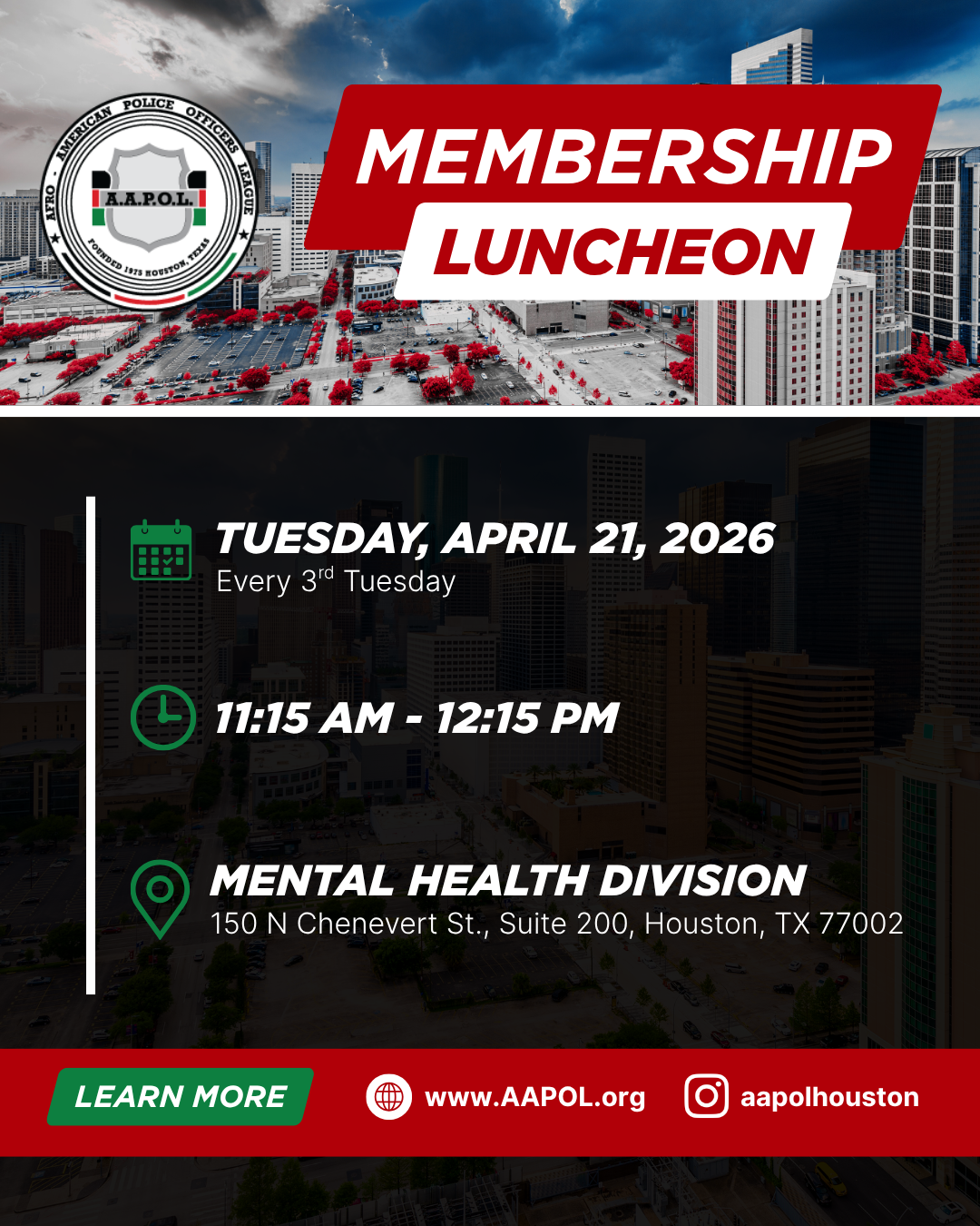April Membership Luncheon Tuesday, April 21, 2026 11:15 AM 12:15 PM Mental Health Division 150 North Chenevert Street Houston, TX, 77002 United States (map) Google Calendar ICS